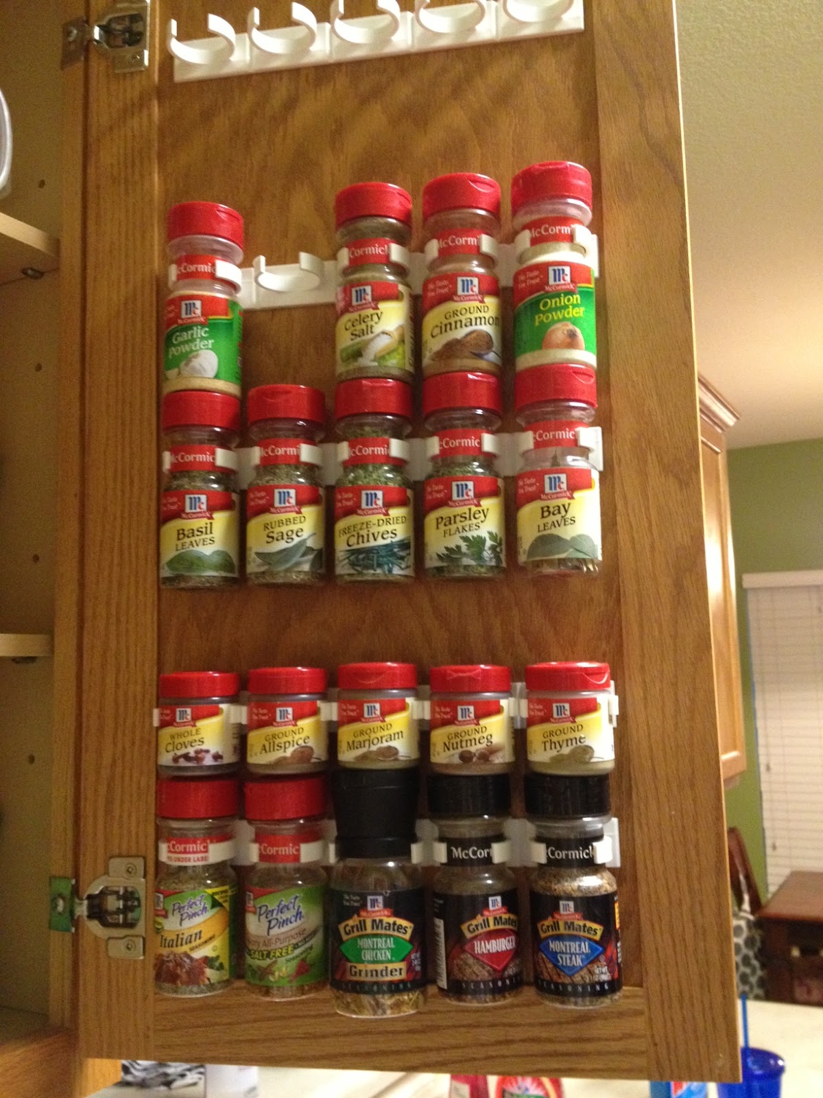 My spices were in rough shape and I had doubles of several things because I could never find what I needed. I found this idea from a blog and amazon prime sold them to me for pretty cheap. I think this cabinet door is my favorite area of the whole kitchen!